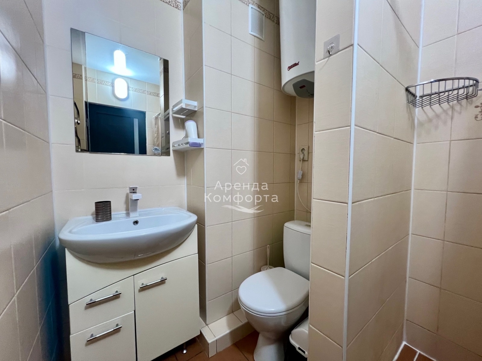 Душевая, раковина, с/у, бойлер с горячей водой, фен для волос.