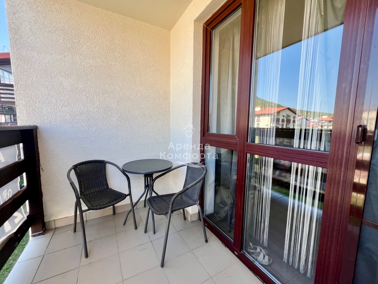 Мебель на балконе: два стула и столик.